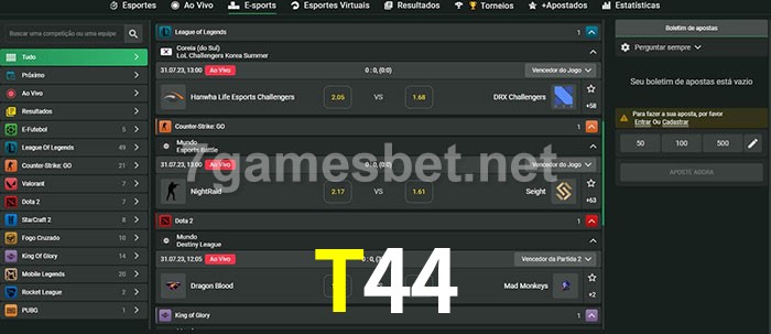 O T44 oferece uma grande seleção de opções de apostas em e-sports com probabilidades competitivas